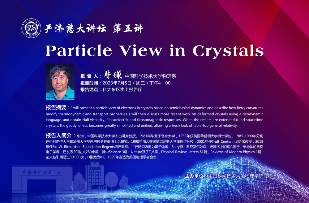 牛谦,中国科学技术大学杰出讲席教授。1981年毕业于北京大学,1985年获美国华盛顿大学博士学位。1985-1990年分别在伊利诺伊大学和加州大学圣巴巴拉分校做博士后研究。1990年加入美国德克萨斯大学奥斯汀分校,2001年任Trull Centennial讲席教授,2019年任Sid W. Richardson Foundation Regents讲席教授。主要研究方向为量子输运、Berry相、自旋霍尔效应、光晶格中的超冷原子、半导体的自旋电子学等。已发表SCI论文280余篇,其中Science 3篇,Nature及子刊6篇,Physical Review Letters 81篇,Reviews of Modern Physics 1篇。论文被引用超过30,000次,H指数为81。1999年当选为美国物理学会会士。