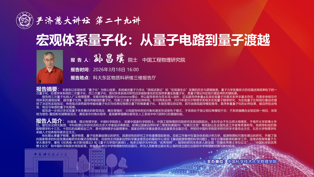 3月18日【严济慈大讲坛】第二十九讲《宏观体系量子化:从量子电路到量子渡越》 [2026-03-12]