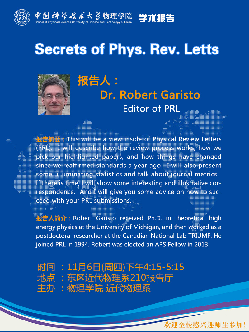 Title: Secrets of Phys. Rev. Letts Speaker: Dr. Robert Garisto, Editor of PRL Time: 4:15PM-5:15PM, Nov. 6th; Thursday. Location: Modern Physics Department, Room 210 Abstract: This will be a view inside of Physical Review Letters (PRL). I will describe how the review process works, how we pick our highlighted papers, and how things have changed since we reaffirmed standards a year ago. I will also present some illuminating statistics and talk about journal metrics. If there is time, I will show some interesting and illustrative correspondence. And I will give you some advice on how to succeed with your PRL submissions. Robert Garisto received Ph.D. in theoretical high energy physics at the University of Michigan, and then worked as a postdoctoral researcher at the Canadian National Lab TRIUMF. He joined PRL in 1994. Robert was elected an APS Fellow in 2013.