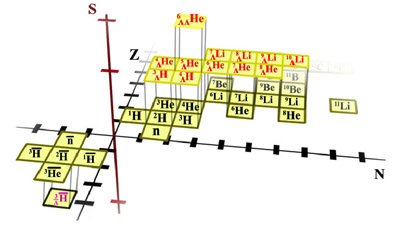 地球上所有的原子核都是由中子和质子组成的(即原子核由上夸克和下夸克组成)。含有一个或多个奇异夸克的原子核叫超核。元素周期表是根据质子数编排的。质子数决定了每种元素的化学性质。物理学家用一个更复杂的三维核素图来描述原子核的中子数和奇异量子数信息。N轴表示核内中子数,第三个轴代表奇异数S (常规是正奇异夸克的奇异数为负)。同一种元素的不同同位素的中子数是不一样的,其奇异量子数取决于存在的奇异夸克。奇异数对于通常自然界存在的物质而言均为零,但是在坍塌星中可能不为零。有奇异夸克的超核出现在三维核素图的上平面,有反奇异夸克的反超核位于三维核素图中Z和N为负数的区域。新发现的反超氚(粉红色表示)是反奇异物质存在的第一次记录,把三维核素图扩展到新的反奇异物质区域。
