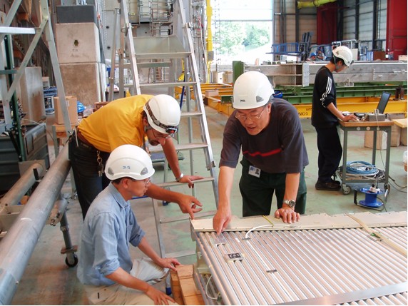 图3 赵政国教授(左一)在西欧核子中心指导研究人员建造muon谱仪。右一为科大研究生