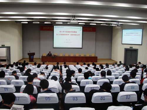 许武书记在报告中结合我校实际,就深入学习实践科学发展观,办人民满意的世界一流研究型大学向学员进行了详细的阐述。许武在报告中指出:科学发展的根本就是按照科教规律办学,文化自觉是科学发展的基础,以及我校学习实践活动的目标是办人民满意的高等教育,发展的核心是以人为本、以学生为本,同时要围绕学生需求,不断改进教育方式。