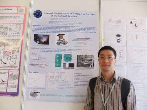 2011年8月11日至18日,第32届国际宇宙线大会(The 32nd International Cosmic Ray Conference,ICRC2011)在北京召开,近代物理系核探测与核电子学国家重点实验室的封常青博士后、张云龙博士受邀参会,就近代物理系在我国空间暗物质探测卫星地面原型系统研制过程中所取得的工作成果,张贴了大会海报“Readout Electronics for the Prototype Detector of the TANSUO Satellite”,并做口头报告“The High Energy Electrons/Positrons Detector of China”。