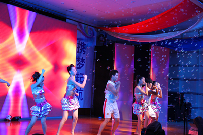19时整,聚光灯束让演出舞台瞬间炽烈。十数位充满青春活力的姑娘、间插三两搞怪的小伙儿出现在观众视线中。突然,音乐四起,动感火辣的开场舞《waka waka》在一片惊呼声中拉开了晚会的帷幕。