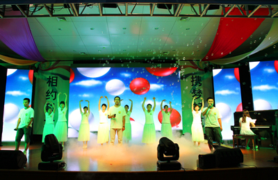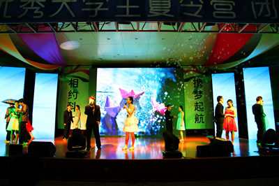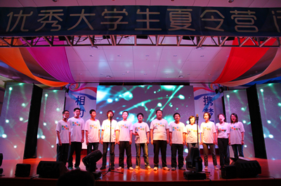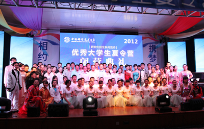 | 7月12日晚,平素宁静的西活礼堂刹那间沸腾。灯光如炽、人流如梭,在这令人陶醉的仲夏之夜,700余观众齐聚一堂,通过一场由参加本届夏令营的600余名优秀学子自编自导自演的文艺晚会,热烈庆祝我校研究生招生系列活动暨2012优秀大学生夏令营完美闭幕。 研究生院、数学科学学院、物理学院、化学与材料科学学院、生命科学学院、地球和空间科学学院、合肥微尺度物质科学国家实验室(筹)、同步辐射国家实验室的相关负责人出席闭幕仪式并观看文艺晚会。