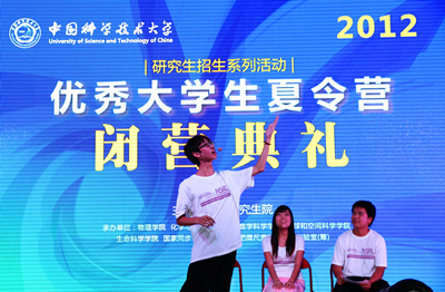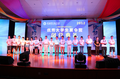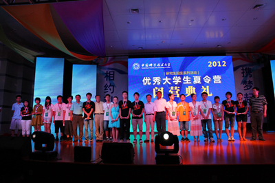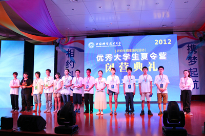 在经久不息的掌声中,13名获得本届“中国科大2012年优秀大学生夏令营最佳表现奖”荣誉称号的营员登台受奖。作为获得“最佳表现奖”的营员代表,来自中国地质大学(武汉)的陈瑞山似乎有些激动:“六天来,科大纯净、自由的学风和以人为本的服务理念最让我印象深刻,在夏令营中我们一起参加报告会、探讨学术、参观实验室、交流观点等等,已经成为我人生中不可磨灭的记忆。希望这次所有来到科大的人都能留下来!”