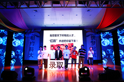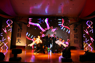 一句“虽累犹荣”引爆了会场最热烈的掌声。忽然,全场寂静,男女生对唱《小酒窝》在一幕哑剧式的开端中如一袭清风由远而近,甜美的歌声中满含脉脉深情;而情景剧《留下来》则在结尾处伴随着流行歌曲《最炫民族风》的背景音乐,搞怪歌词“你是我心中合适的人才,“泥石”浇溶把你留下来!永远都乘着科学的春风,让爱卷走所有的徘徊”让晚会再次达了高潮。