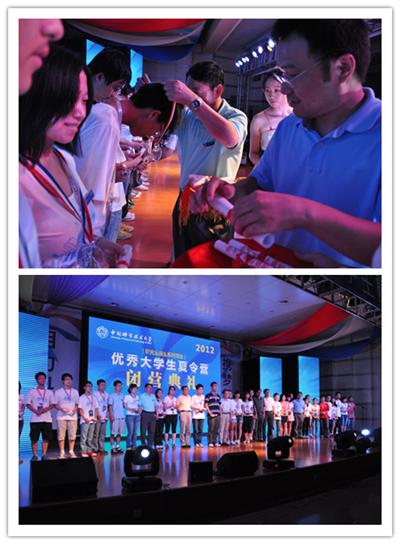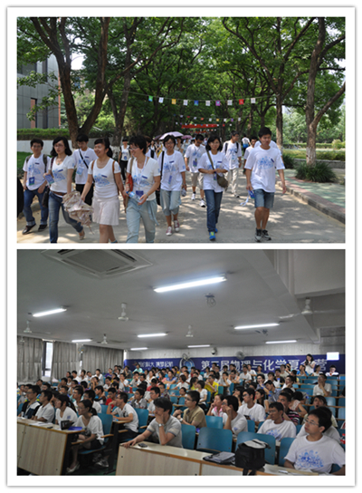 接天莲叶无穷碧,映日荷花别样红。七月的合肥,再次迎来了全国各地的优秀学子们。中国科学技术大学第三届物理化学夏令营于7月8日至14日在合肥、九华山举办。一个星期的时间里,营员们通过学术讲座、实验室参观、师生交流等活动,全面了解了中国科大的优美环境和学术品格。这学术与休闲、亲情与友谊交织的一周,将成为253名营员最美好的夏日记忆。 科大 我们来了! 作为本届大学生夏令营中规模最大、人数最多的分营,物理与化学夏令营的筹备工作一直有条不紊地进行着。早在入营前一周,营员和志愿者就通过QQ群相互结识,在驻地见面时,大家竟有老友重逢之感。报到日的见面会上,尽管由于空调故障,会场有些闷热,二百多位营员依然屏息凝神,认真倾听志愿者交待事项,兴奋和期待写在每一张青涩的脸上。 7月8日上午,开营式在西区活动中心举行,化学分营营员、来自东北大学的何凯同学代表638位营员发言。他表示,在夏令营期间,一定用心去感受科大文化的自由与宽厚,去探究科学世界的博大与高深,不辜负科大的热情。这是何凯的郑重承诺,也是全体营员共同的心声。 遨游 在学术的海洋