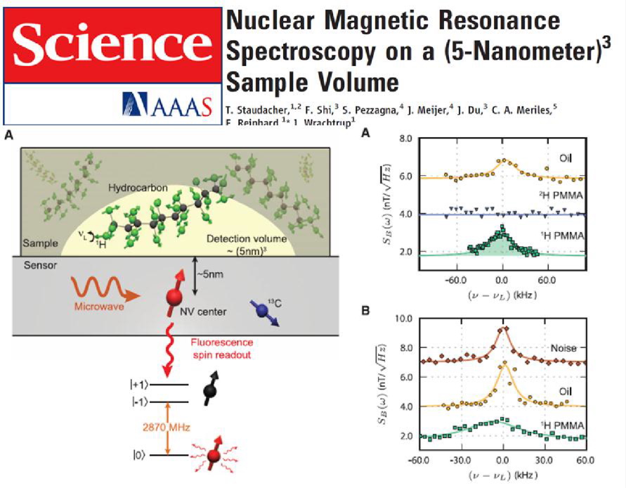 近代物理系杜江峰教授研究组与德国斯图加特大学Wrachtrup组合作,选取了NV色心固态单自旋作为探针,代替传统的电探测方式,将微观自旋体系产生的弱磁信号转为相干态的相位,从而实现高灵敏度的信号检测。基于此原理,通过多次尝试及技术的改进,最终用近表面的NV探针成功实验实现了体积仅为(5nm)3中氢核自旋样品的检测,灵敏度相当于100个极化的氢核自旋。文章在《科学》发表后,很快得到包括《自然》、《物理世界》等国际学术媒体的关注和报道。《科学》杂志专文报道称之为“通向分子尺度磁共振成像的关键性进展”。