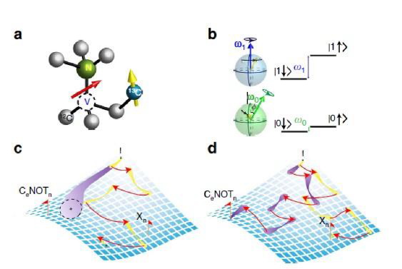 近代物理系杜江峰教授研究组将能够有效抑制退相干的动力学解耦技术与量子逻辑门相结合,给NV色心的电子自旋施加特定间隔的动力学解耦脉冲,在保护电子自旋相干性的同时,引导邻近的13C核自旋完成特定的演化,进而实现普适的量子逻辑门操作。他们理论设计并在实验上演示了受控非门,用该量子逻辑门实现了电子自旋和核自旋的最大纠缠态的制备,并进一步测试了该量子逻辑门的多次操作效果,发现它能将电子自旋相干时间延长30倍。研究成果发表在Nature Communications 4, 2254 (2013)。