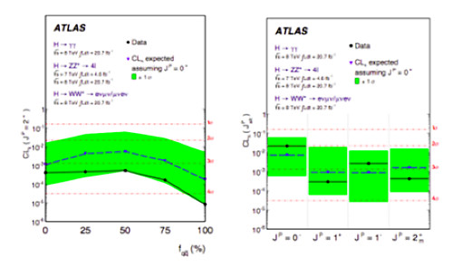 近代物理系赵政国院士研究组利用ATLAS实验获得的质子-质子对撞数据研究Higgs粒子的自旋和宇称量子数。将双光子,W+W-(两轻子末态)和ZZ(四轻子末态)联合起来,自旋和宇称为0-,1+,1-,2+等假设都可以被统计显著地排除。双光子和W+W-末态用的是2012年全年采集的质心能量为8TeV的质子-质子对撞数据,积分亮度为20.7fb-1。ZZ衰变道还加上了2011年的4.6fb-1质心能量为7 TeV的质子-质子对撞数据。这项研究为2012年新发现的粒子的确为0+(与标准模型Higgs粒子性质吻合)提供了证据。其他的JP如0-; 1+; 1-; 2+被排除的置信度都在97.8%以上。这个结论不依赖于Higgs粒子与标准模型耦合强度的假设。自旋为2的假设排除置信度不依赖于产生过程胶子-胶子聚合与夸克-反夸克湮灭的比例。