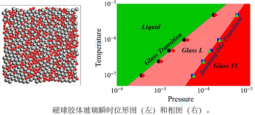 硬球胶体玻璃中的颗粒长时间在平衡位置附近振动而无法逃逸。然而,如果降至零温,使得颗粒的运动速度为零,该体系将由于颗粒不相接触而丧失刚性,这也就转化为硬球体系静态堆积的问题。静态堆积的硬球只有当堆积密度达到无规密堆积密度、发生Jamming转变的时候才会形成有刚性的非晶固体。近期的研究表明Jamming转变密度高于硬球胶体的玻璃化转变密度,因此,处于这两个密度之间的硬球胶体玻璃表现出奇异性:零温的时候体系没有刚性,而一旦有热运动的介入,体系马上形成有刚性的固体。是什么原因导致了硬球胶体玻璃的特殊性?硬球胶体玻璃是否会挑战我们对固体的认知?