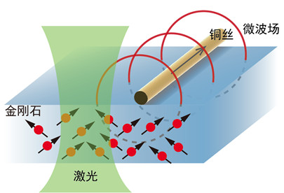 配图:实验原理示意图。激光用于测量钻石探针的量子状态,读出拉比振荡的频率。高频振荡的电流在一根22微米直径(人的头发丝直径约为80微米)的铜丝中传输,产生了高频振荡的微波磁场(红线代表磁感线),磁场穿过金刚石与大气的边界,辐射至钻石探针上(黑色箭头)。