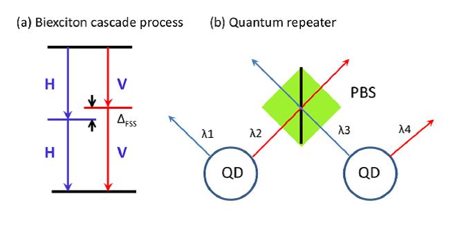 图:(a)量子点纠缠光源原理图;(b)利用偏振分光镜将不同量子点发出的纠缠光子对级联,从而实现量子中继。