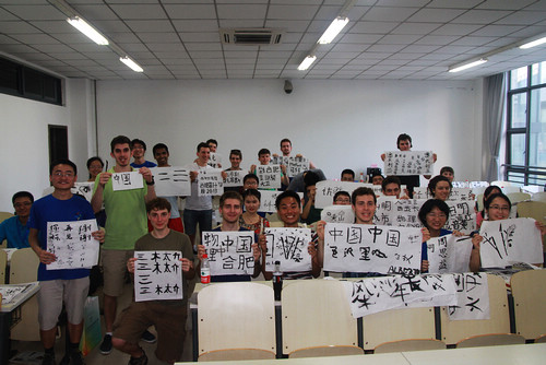 在书法课上,在志愿者和老师的帮助下,国外营员从学习如何使用毛笔开始,逐渐写出自己的作品。Let’s take a group photo with your calligraphy, Say 茄子!