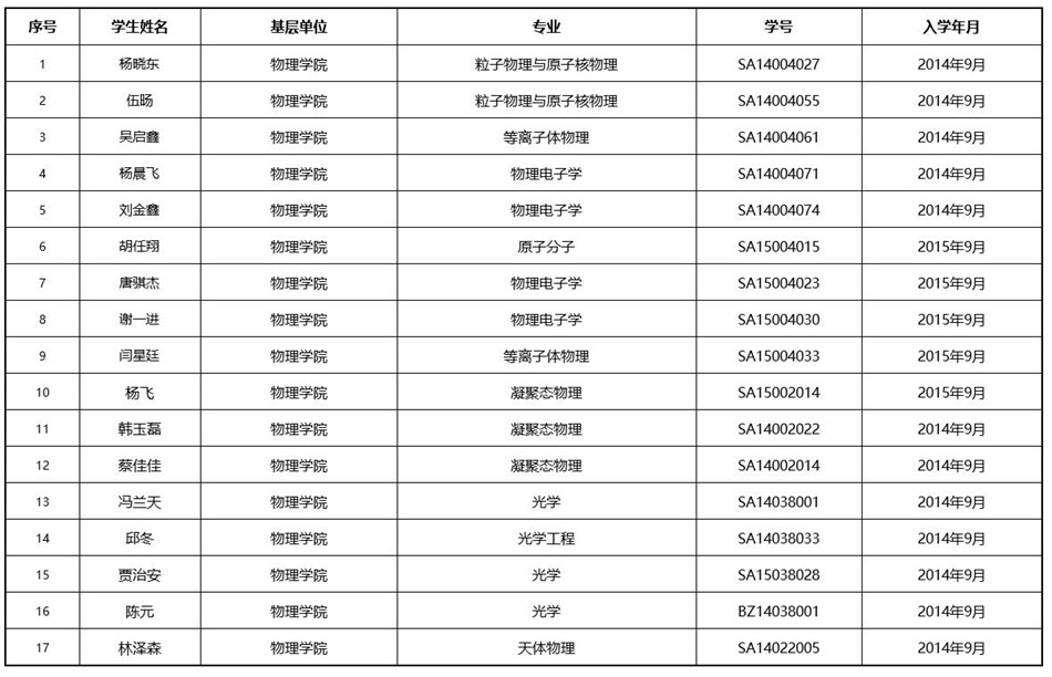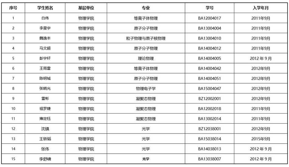 物理学院评选2016年度研究生国家奖学金工作基本上已经完成,根据各系评审委员会成员投票,学生意愿,物理学院最终推荐32名(博士15名、硕士17名)研究生上报研究生院,现将名单公布如下, 对以下结果如有异议,五天内请直接打电话至2系崔宏滨老师(63607624)、4系朱林繁老师(63600023)、22系袁业飞老师(63606846)、38系张永生老师(63607340)或者请直接向物理学院张义红老师(63600462)和张增明老师(63607671)反映情况。