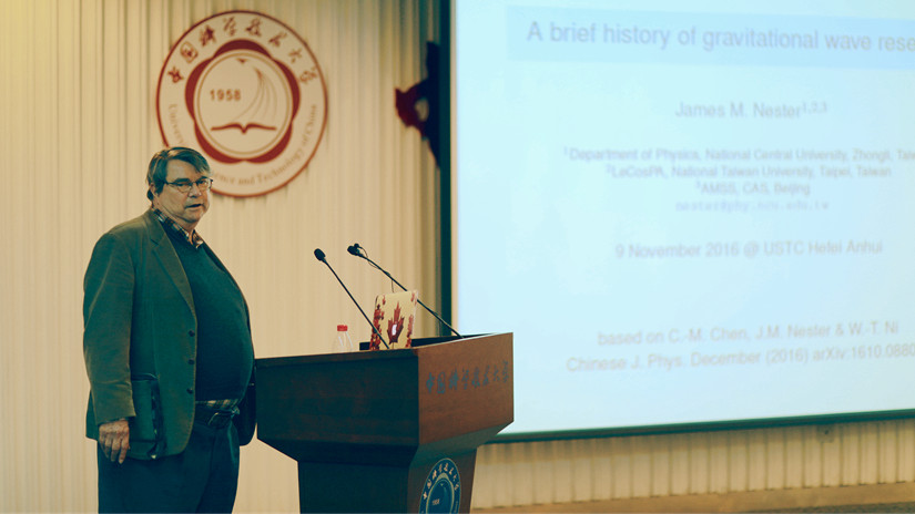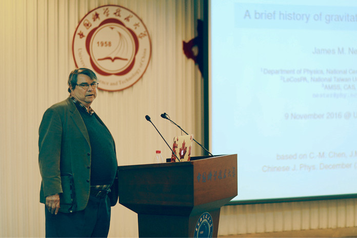 11月9日晚,来自台湾中央大学的国际知名引力物理学家 James Nester 教授在理论大楼科技展厅面向全校师生带来了题为“引力波研究简史”的科普报告,激起了同学们对引力理论、引力波探测的发展过程等有关问题的浓厚兴趣,并在报告之后对同学们的问题进行了细致回答,赢得热烈掌声。整场报告由物理学院天文系教授蔡一夫主持。