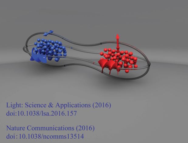 史保森教授、丁冬生副研究员等开展了多自由度量子纠缠的存储研究,他们首先基于原子系综的自发拉曼过程,利用自锁定的干涉技术产生了光子偏振与原子自旋波波矢的二维纠缠和光子与自旋波的OAM三维纠缠,而后将单光子送到第二个冷原子系综,利用另一个自锁定干涉仪将其存储下来,从而在两个原子系综之间建立了自旋波波矢和OAM两个自由度之间的 超纠缠。该项成果对构建不同自由度的混合量子网络具有重要参考价值,对不同存储单元之间不同自由度纠缠的兼容性问题研究具有重要意义。主要成果发表在Nat. Commun. 7, Article Number 13514 (2016)。