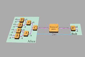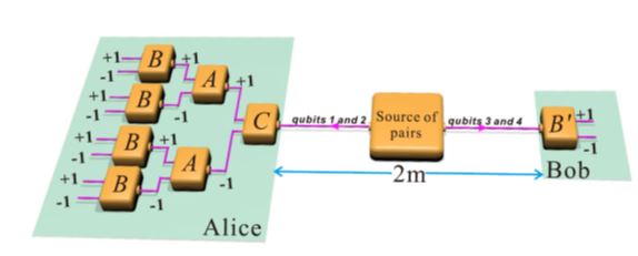 李传锋研究组对这两个问题展开了细致的实验研究。他们设计出一种精妙的光学分束器,利用它在实验上制备出高保真度的两光子四比特纠缠态,然后把两个光子(分别携带两个比特)分发给A和B两个测量者。二者分别对自己的两个比特进行一系列测量。研究组首先实验验证纠缠态本身不能违背Bell不等式,没有非局域性。然后,他们对A边的光子做相继测量,进行互文性检验的同时检验相应的Bell不等式。结果表明,这时Bell不等式被违背了,也就是说他们利用量子互文性产生出了量子非局域性。另一方面,这个不等式恰好可以从自由意志定理推导出来,它的违背意味着对于光子的测量结果与其历史无关,为堵上非局域性检验中的自由意志漏洞打下重要基础。