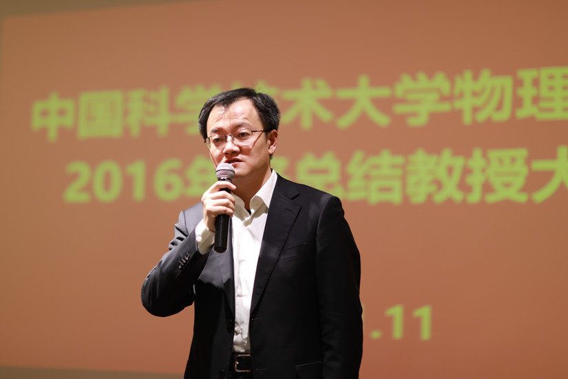 物理学院执行院长杜江峰院士以《不忘初心,向世界一流物理学院迈步跨进》为题,对2016年学院工作进行了总体回顾。他首先对学院师资队伍、人员结构进行了分析,介绍了2016年物理学院发生的重大事件和产生的重大科研成果,对学院学科发展状况进行了点评。另外结合目前国内大环境变化,分析了物理学院要完成建设世界一流物理学院目标将面对的机遇与挑战。最后,杜江峰院长指出,今年物理学院筹划建立学院发展基金,年终总结教授大会首次邀请校友参与,希望广大校友积极参与学院建设,为学院发展建言献策。