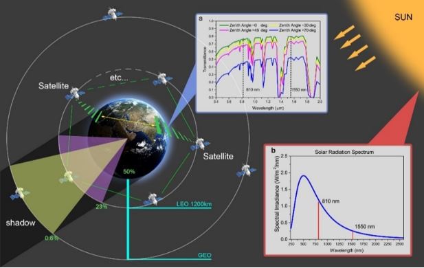 基于卫星平台的量子通信是构建覆盖全球量子通信网络最为可行的手段,世界首颗量子科学实验卫星“墨子号”目前已经在国际上成功实现了首次星地量子通信,为未来开展大尺度量子网络和量子通信实验研究奠定了可靠的技术基础。然而由于阳光噪声的影响,“墨子号”卫星只能在夜晚工作,单颗该类低轨道卫星至少需要三天才能完成全球范围内地面站点的覆盖。为了提高通信覆盖率,以提高卫星量子通信实用化水平,一种可行的解决途径是构建由多颗低轨道卫星或高轨道卫星组成的量子星座,建立覆盖全球的实时量子通信网络。为了构建量子星座,需要突破以下两个技术难题:一是通信距离较远导致的链路损耗较大,星座通信链路损耗典型值大于40-45dB;二是随着卫星轨道的升高,卫星被太阳光照射的概率增大,例如,轨道高度500km的“墨子号”卫星被太阳光照射的概率是68%,而轨道高度36000km的地球同步轨道卫星被太阳光照射的概率达99.4%,而白天阳光照射噪声是夜晚的5个数量级以上。