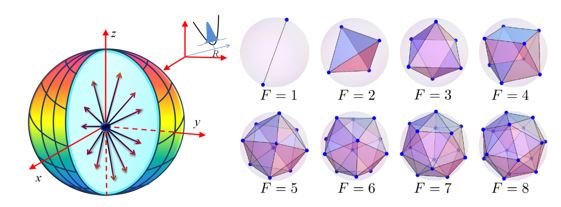 左图表示方案中利用磁单极场实现的球面束缚势阱,R表示球面的半径。右图表示在考虑到中性原子相互作用后,形成的球面上的涡漩分布图样;图中每个蓝点对应一个涡漩核心,其分布图样与球面上等数目电子的稳定构型(经典Thomson问题)是一样的,反应了该系统中涡漩和电子的对偶特征。