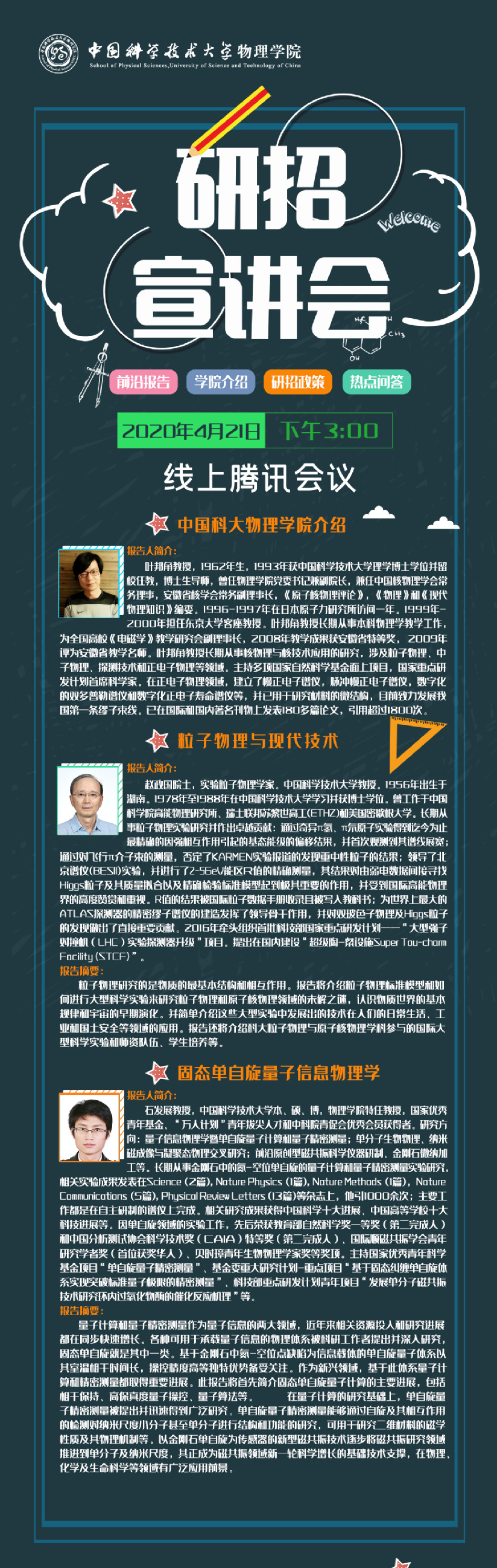 物理学院研究生招生网络宣讲会(华中、西北地区),4月21日下午15:00腾讯会议不见不散,有意向参加与学生线上咨询互动的导师,与物理学院张义红联系。