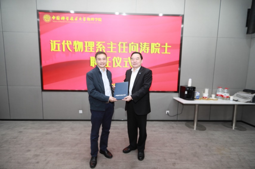 2021年4月9日,中国科学技术大学近代物理系主任向涛院士聘任仪式在物质科研楼一楼会议室举行。校长包信和院士、赵政国院士、物理学院执行院长陈宇翱、物理学院党委书记兼副院长陈向军、近代物理系执行主任彭新华以及近代物理系各学科负责人、教师代表参加了会议。会议由陈向军主持。
