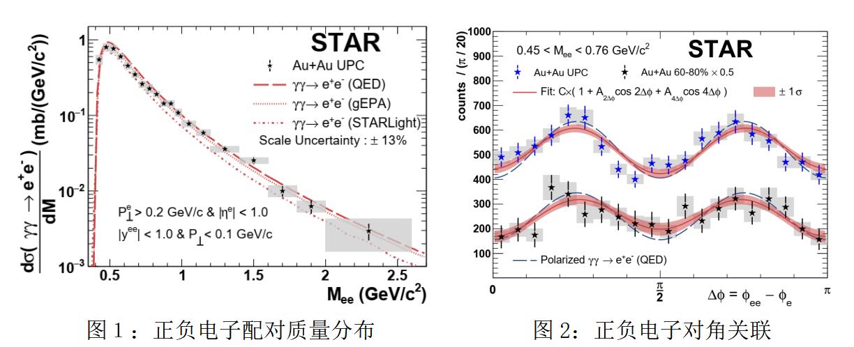我院近代物理系首任系主任赵忠尧先生是人类物理学史上第一个发现反物质的物理学家,并观测到正负电子对的湮灭现象:e+ + e- →γ + γ。1934年,科学家布雷特和惠勒提出这个现象的反过程,让两个光子通过撞击结合在一起,有可能变成物质,形成电子和正电子。这种把光变成物质的过程是爱因斯坦质能方程E=mc2的直接反映,表明能量和质量是可以相互转化的。长期以来,人们期望通过超强功率的激光碰撞来观测这个过程,然而两个光子发生碰撞的概率非常低,其所需的最低激光功率仍然比目前功率最高的激光系统要高几个数量级。在布雷特和惠勒提出这个反应过程时,激光并没有被发明,他们提出可以通过加速重离子到相对论能区并碰撞来实现光生物质。RHIC-STAR的研究团队利用相对论重离子碰撞来寻找布雷特-惠勒的产生过程,在海量数据中找到6000多正负电子对,通过分析这些候选事例的配对质量和角分布以及与理论计算的比较,证实这些正负电子对源自布雷特-惠勒过程。更进一步,该研究团队观测到正负电子对的角关联呈现4阶余弦振荡,这是真空双折射现象的有力证据。