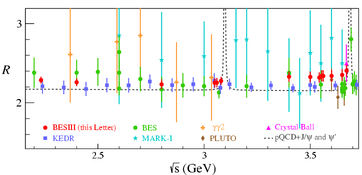 图:不同实验在2.2 - 3.7 GeV能区的R值