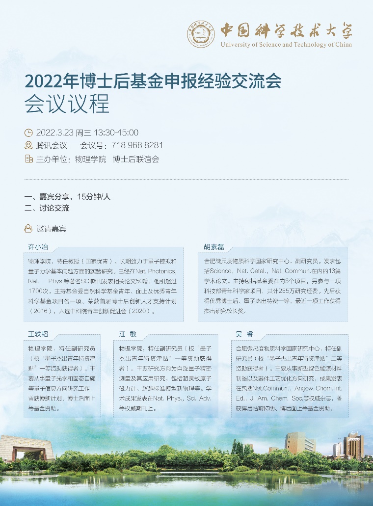 2022年3月23日下午,2022年度国家博士后基金申请经验交流会在物理学院成功举办。会议由物理学院和博士后联谊会共同组织。物理学院许小冶、王轶韬、江敏,合肥微尺度物质科学国家研究中心胡素磊、吴睿等五位嘉宾参会并作经验分享。会议获学院及校内聘期制科研人员的积极响应,共收到240余位感兴趣师生的参会申请。