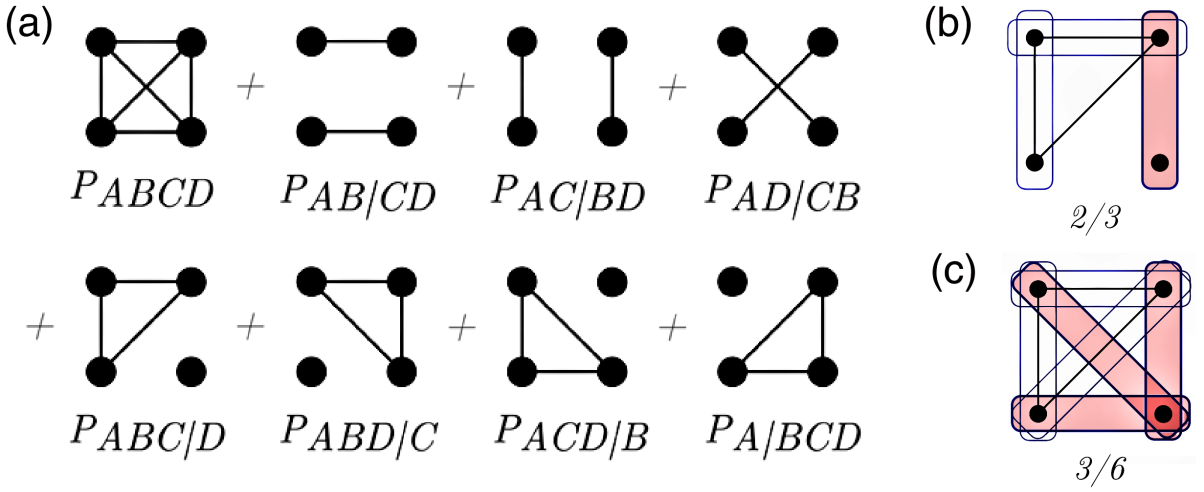 图:(a)四体纠缠的结构解析。黑点代表粒子,连线代表纠缠。四体纠缠可以分解成四体真纠缠、两个两体纠缠等;(b)最小的连通集合;(c)完全的连通集合。
