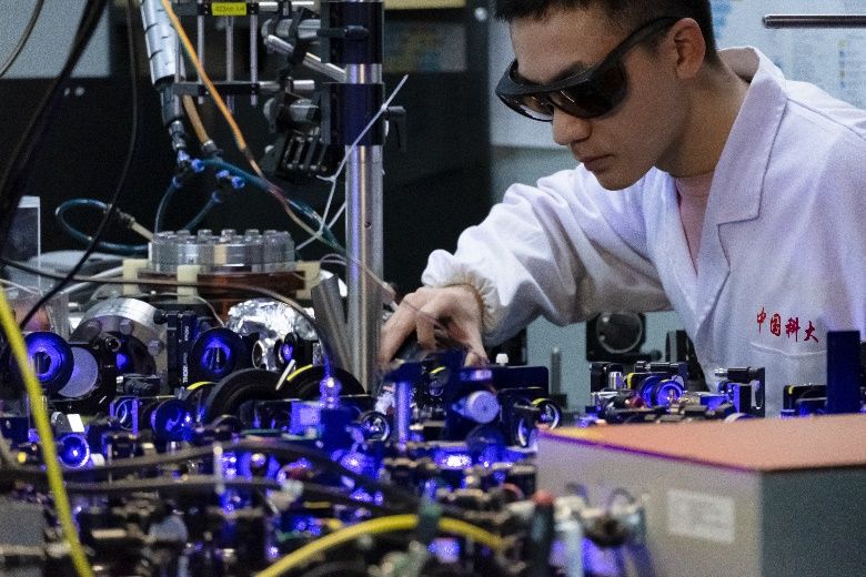 图3.博士研究生孙伟伟在调试用于操控、俘获原子的激光系统