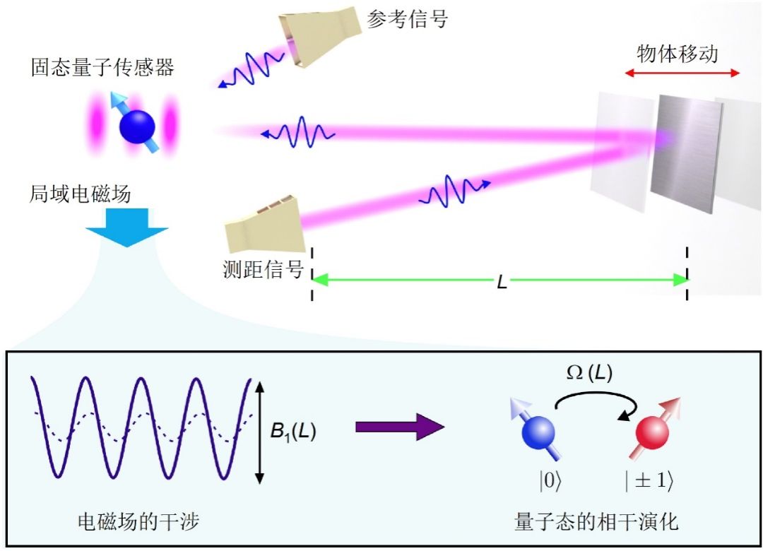 图1基于固态自旋量子体系的射频信号探测与测距示意图。