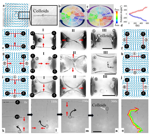 液晶是一类分子取向长程有序的各向异性材料,其在显示、感应、光子器件等领域有广泛应用。研究团队首先利用自搭建的装置通过预设计的方式控制偶氮苯分子机器排列,从而控制液晶微结构自组装并制备了可编程控制的向错线网络。在光驱动作用下,偶氮苯分子机器的协同作用引起衬底表面液晶微结构分子取向的变化,从而引发样品内部向错网络的群体动力学形态变化。如果将胶体颗粒置于此远离平衡态的系统中,随着光驱动向错线网络的形变,胶体颗粒可以被灵活地捡起、运输和重新组装。不仅如此,胶体自组装的集体运输和重组还可以通过控制照射光的偏振方向,控制他们运输的方向和方式,比如平移、以顺时针方向或者逆时针方向旋转,从而实现了微米尺度胶体颗粒的可编程自组装。