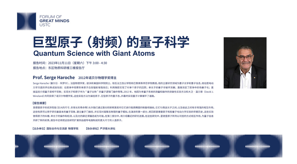 11月11日大师讲坛&“严济慈大讲坛”第八讲Serge Haroche教授《巨型原子(射频)的量子科学 》