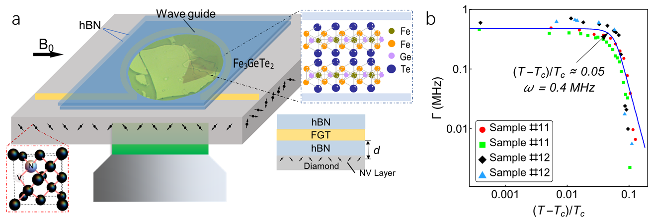 图1:(a)实验设计构型图。hBN-FGT-hBN结构转移到含系综NV色心的金刚石薄片的表面。(b)不同约化温度下,NV色心退相干率的变化。FGT中临界涨落在频率Γ处的噪声谱密度ω=Γ。图中的转变(t=0.05,ω= 0.4 MHz)恰为FGT体系噪声谱特征转变的频率。