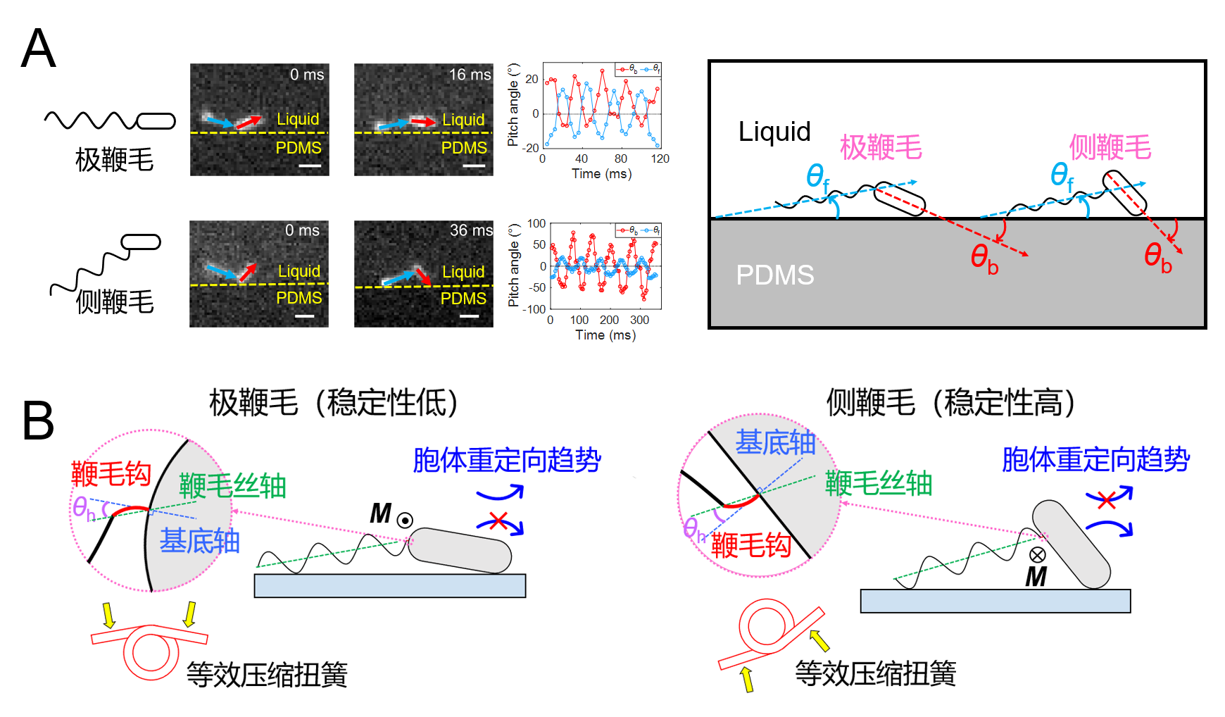 为了探究这一现象背后的物理机制,研究组进一步通过高时空分辨的荧光成像技术,直接观测了细菌在表面附近的姿态角变化(图1),提出了鞭毛钩弯曲力矩的关键作用。他们发现,当细菌“头朝下”撞向表面时,鞭毛钩会因受力而弯曲。对于鞭毛在极端的细菌,弯曲的鞭毛钩产生的力矩会帮助细胞体调整姿态,使其更容易通过热涨落(布朗运动)从表面逃逸。然而,对于鞭毛在侧面的细菌,鞭毛钩的弯曲方向与极端鞭毛相反,其产生的力矩反而会抑制细胞体的姿态调整,使其更稳定地被困在表面,难以逃脱。研究组的理论计算也定量地证实了这一机制。