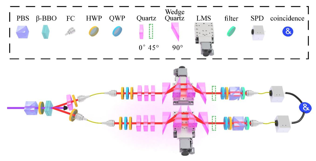 为了更好的控制量子系统的演化,研究团队前期已进行一系列的研究。首先发展了一套对光子偏振和频率进行完备调控的方法,实现了完全可控的相位退相干量子模拟器[Nat.Commun. 9, 3453 (2018)]。接着,为了量子隐形传态任务中更好的克服噪声,开发了基于非局域记忆效应的方法[Phys. Rev. A 102, 062208 (2020)],和只需对单量子系统进行相位调制的多体混合纠缠方法[Science Advances 10, eadj3435 (2024)]。基于以上成果,研究团队在本工作中设计并实现了基于可观测量的多体量子速度极限实验。