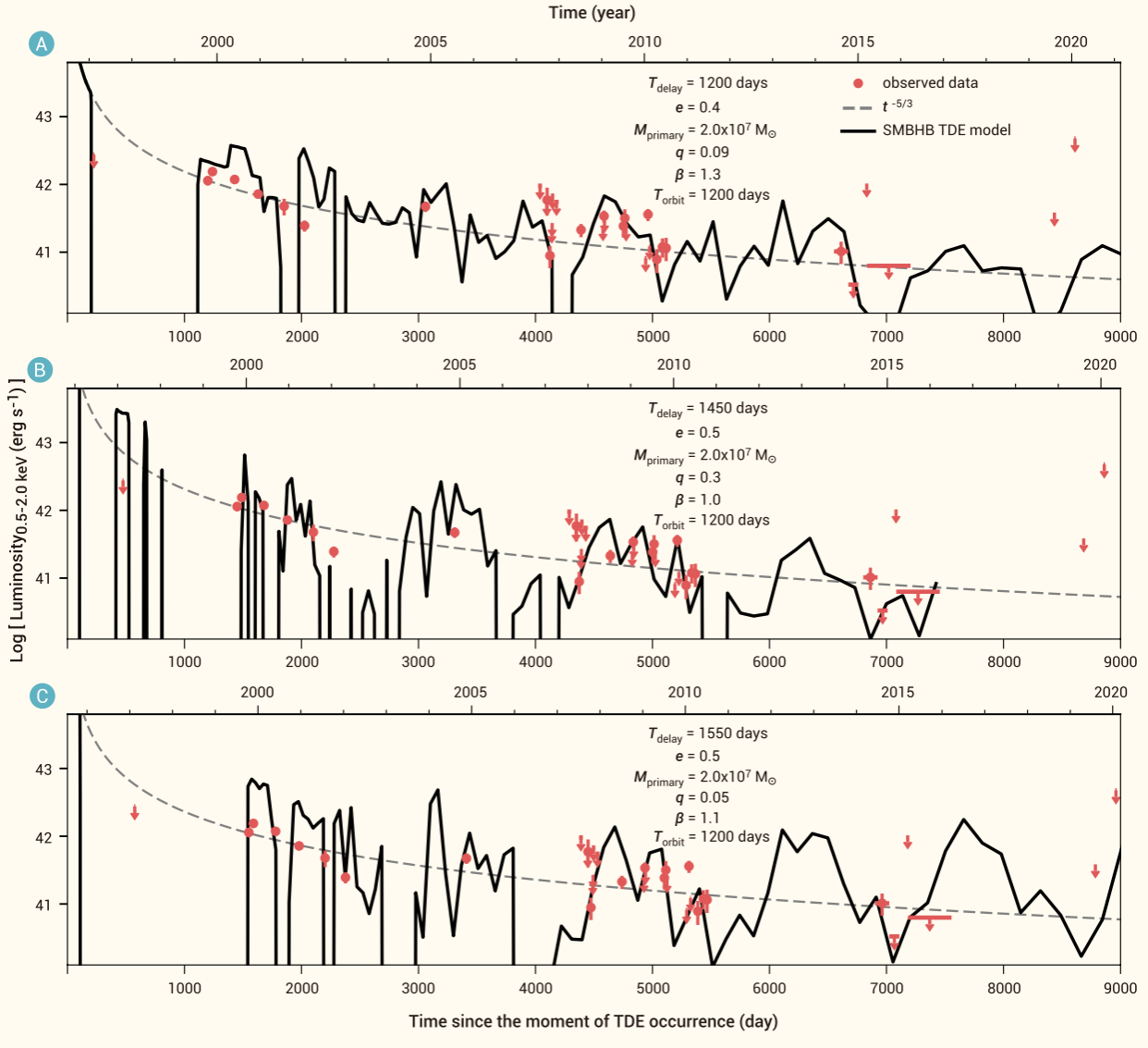 钱德拉南天深场是迄今为止曝光时间最长(约七百万秒)从而最深、最灵敏的X射线巡天。研究团队在钱德拉南天深场中发现了一例光变非常有趣的X射线暂现源(即突然变亮从而被探测到、随后变暗直至无法探测的天体;取名为XID 935),其所有的X射线观测时间跨度接近20年。和光学图像对比,XID 935的位置位于其宿主星系(距离我们约42亿光年)中心,表明它很有可能和中心的超大质量黑洞有关,但通过研究其光谱发现,它并没有活动星系核的光谱特征。另外一种可能是,它是作为前景的银河系内的X射线双星,只不过偶然在我们的视线上与远处的星系中心重合,但通过计算可以发现,X射线双星发生这种事件的概率微乎其微。于是,XID 935最合理的解释就是潮汐撕裂恒星事件,因为别的暂现源图像都无法与观测相符;并且,它是所有已知X射线潮汐撕裂恒星事件中最为暗弱的一例,要不是钱德拉南天深场具有极高的灵敏度,它根本就不会被探测到。通常来说,潮汐撕裂恒星事件的光度在达到峰值后会呈现单调幂律下降的趋势。XID 935的光变之所以有趣,是因为它的光度在整体下降(近20年间变暗超过40倍直至无法探测到)的过程中,还出现了突然变暗又变亮(两个月内变亮超过27倍)的情况,预示着这可能是一例发生在超大质量双黑洞系统中的潮汐撕裂恒星事件——这样的事件非常罕见,之前仅有两例候选体,但它们的数据质量都远不如XID 935,且距离我们都要近得多。与普通的单黑洞潮汐撕裂恒星事件不同,当一颗恒星被主黑洞撕裂,恒星残骸流可能会被次黑洞干扰,导致无法正常回落到主黑洞,物质供给的中断导致光度骤然下降;当次黑洞远离后,恒星残骸流又能正常回落到主黑洞,于是主黑洞继续吸积残骸从而恢复光度(见图1与图2)。