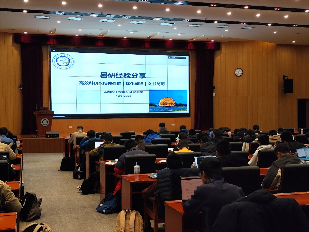 12月6日晚,物理学院在物质科研楼三楼报告厅举办暑研经验分享会。此次分享会由物理学院团委和严济慈物理科技英才班共同主办,是物理学院“悟理有术·学海领航”系列活动之一。物理学院党委凌锋副书记、团委谢羿老师和100余位物理专业本科生参加活动。