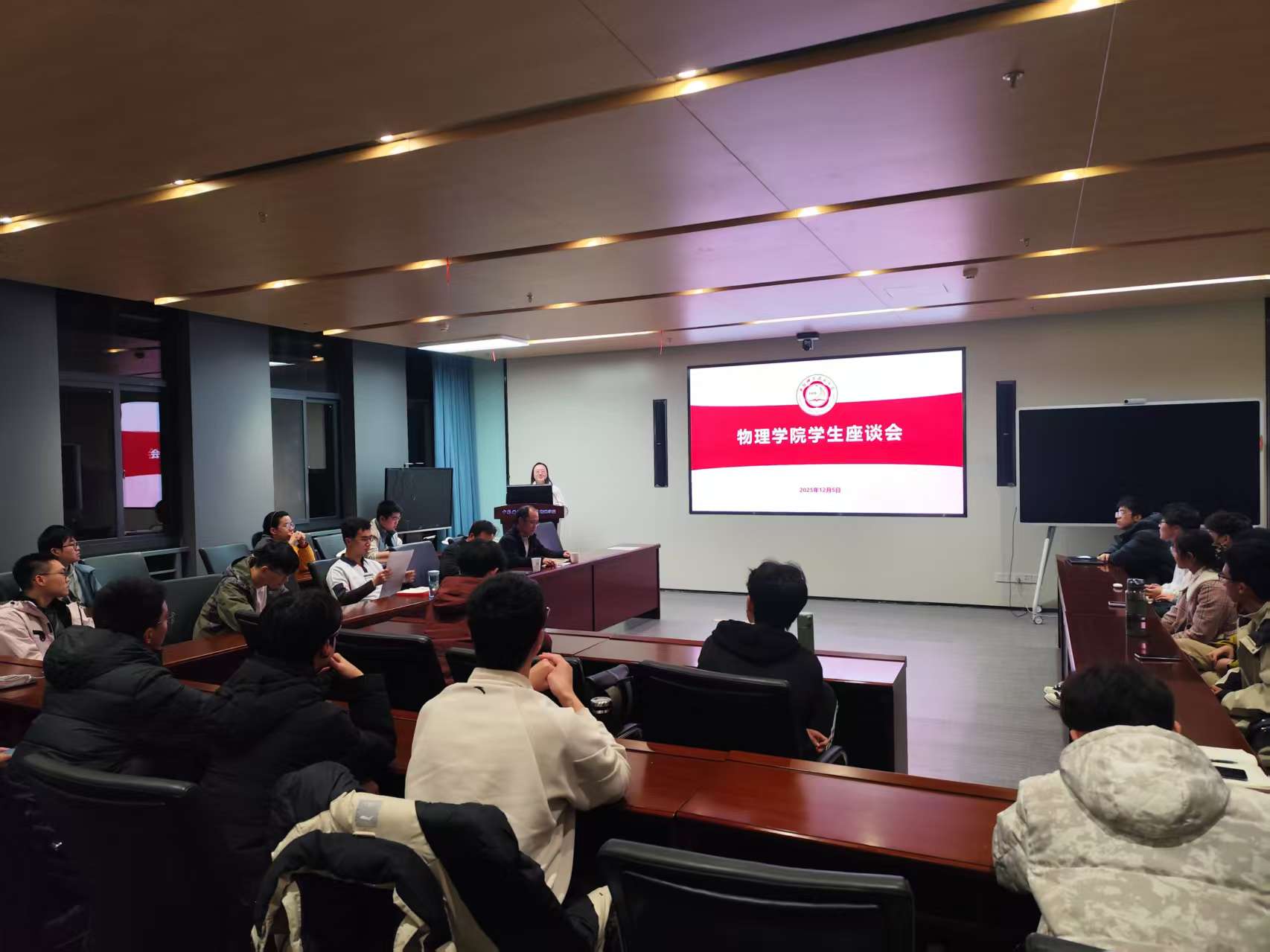 12月5日晚,物理学院在物质科研楼C404举办本科生座谈会。此次分享会由物理学院团委主办,邀请了物理学院24个本科班每班派出一名代表开展座谈交流,党委学生工作处林高华副处长和学院党委凌锋副书记到场指导,会议由物理学院团委书记聂诗琦主持。