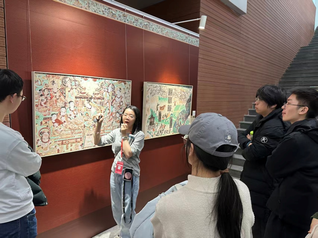 本次展览由敦煌研究院、中国敦煌石窟保护研究基金会与中国科学技术大学联合主办,集文化展示与科技体验于一体。活动伊始,专业讲解员借由壁画图片,为党员们带来了时长1个多小时的细致讲解。从北朝壁画的雄浑质朴、隋唐壁画的绚丽多彩,到五代宋辽的精致典雅,讲解员系统梳理了敦煌壁画在这些不同历史时期的艺术与美学特征。而壁画中那些“九色鹿救溺水人”“飞天反弹琵琶”等经典故事,生动诠释了仁爱、诚信等中华传统美德。同时讲解员深入解读了壁画展现的胡商往来、异域纹饰与中原技法交融的细节,展现了古代丝绸之路作为中西方文化交流桥梁的深厚底蕴,让党员们直观感受中华文明兼容并蓄的鲜明特质。