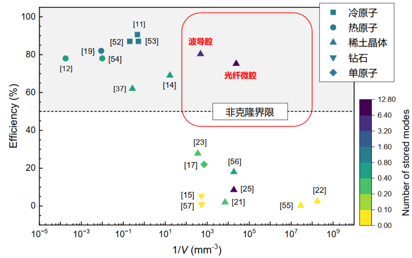 图2:量子存储器的效率及装置体积对比,红框圈出的是本成果的结果