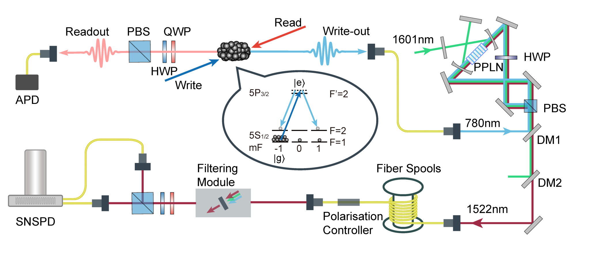 研究的另一项重要亮点在于团队实现了高效率、低噪声的量子频率转换。团队自主研制了基于Sagnac干涉仪架构的偏振无关量子频率转换模块。该模块采用腔增强差频方案,利用周期性极化铌酸锂晶体,将原子系统产生的780nm光子高效地转换至通信波段(1522nm),实现的外部量子效率最高可达 48.5%。同时,该频率转换过程能够保持光子偏振态不变,且附加噪声水平极低,为实现长距离、低损耗的单光子传输提供了关键技术支撑。
